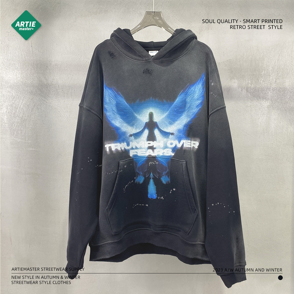 • Angel Wings Printed Sprayed Monkey Washed Distressed Men's Sweatshirts Ripped and Cut Men's Hoodies