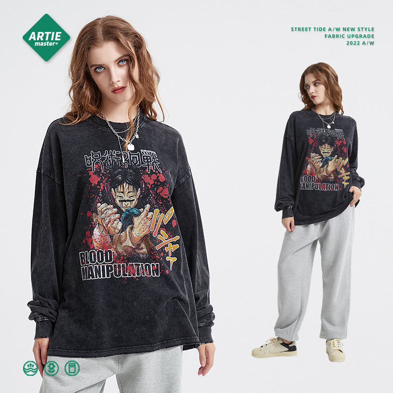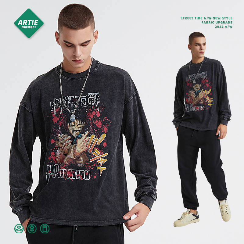 Anime spell digital print long-sleeved T-shirt Washed batik distressed trendy men's T-shirt