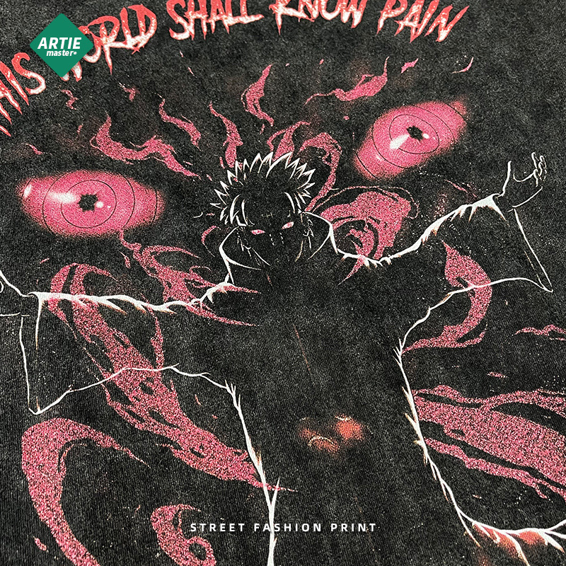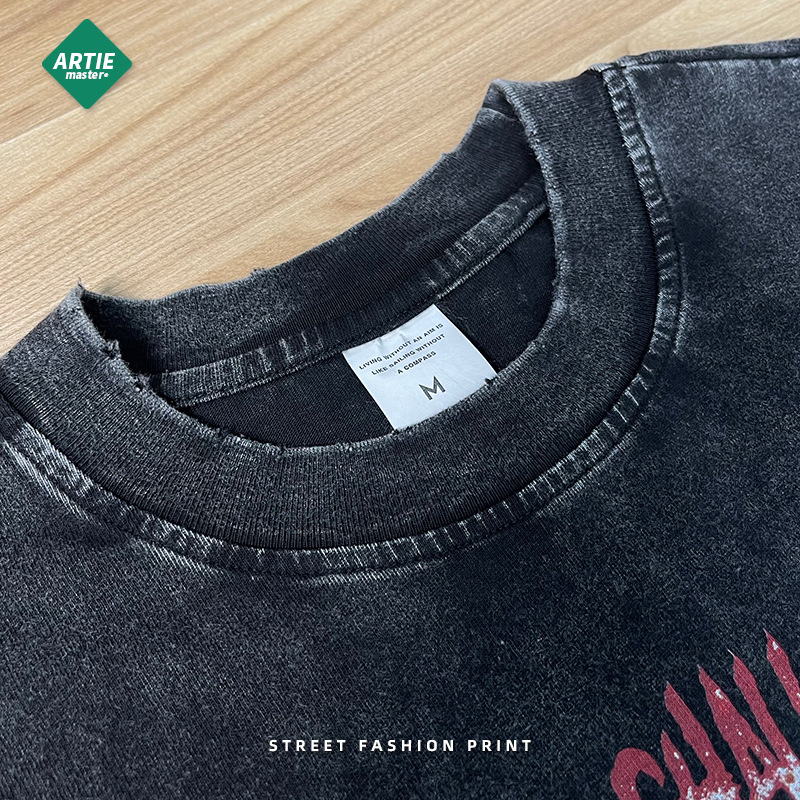 The unique washing process gives the T-shirt a natural fading effect, which complements the printed pattern on the chest. The overall look is both retro and fashionable, full of artistic atmosphere.
